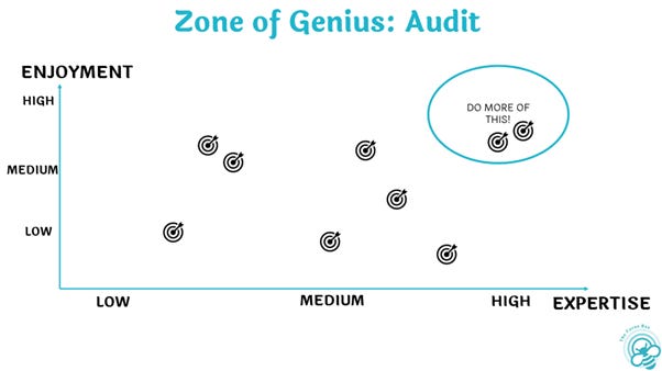 Most of the time, we intuitively know what our Zone of Genius is: these are the activities that we do with ease, that we love doing, that make time speed by, that we would do even if we weren’t paid to do them.